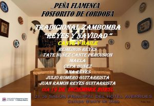 El próximo día 19 de Diciembre la Peña Flamenca Fosforito de Córdoba celebrará la tradicional Zambomba Flamenca en el que intervendrá el grupo “Reyes y Navidad”. Este acto tendrá lugar en el salón principal del hotel Averroes, sito en Campo Madre de Dios, y dará comienzo a las 21:30 horas, siendo el acceso libre hasta completar el aforo del local. Las reservas se realizarán antes de las 12 horas del miércoles 17 de diciembre en el teléfono 626116841. Se ruega accedan al local con antelación suficiente al comienzo del acto por si desean utilizar los servicios de bar.